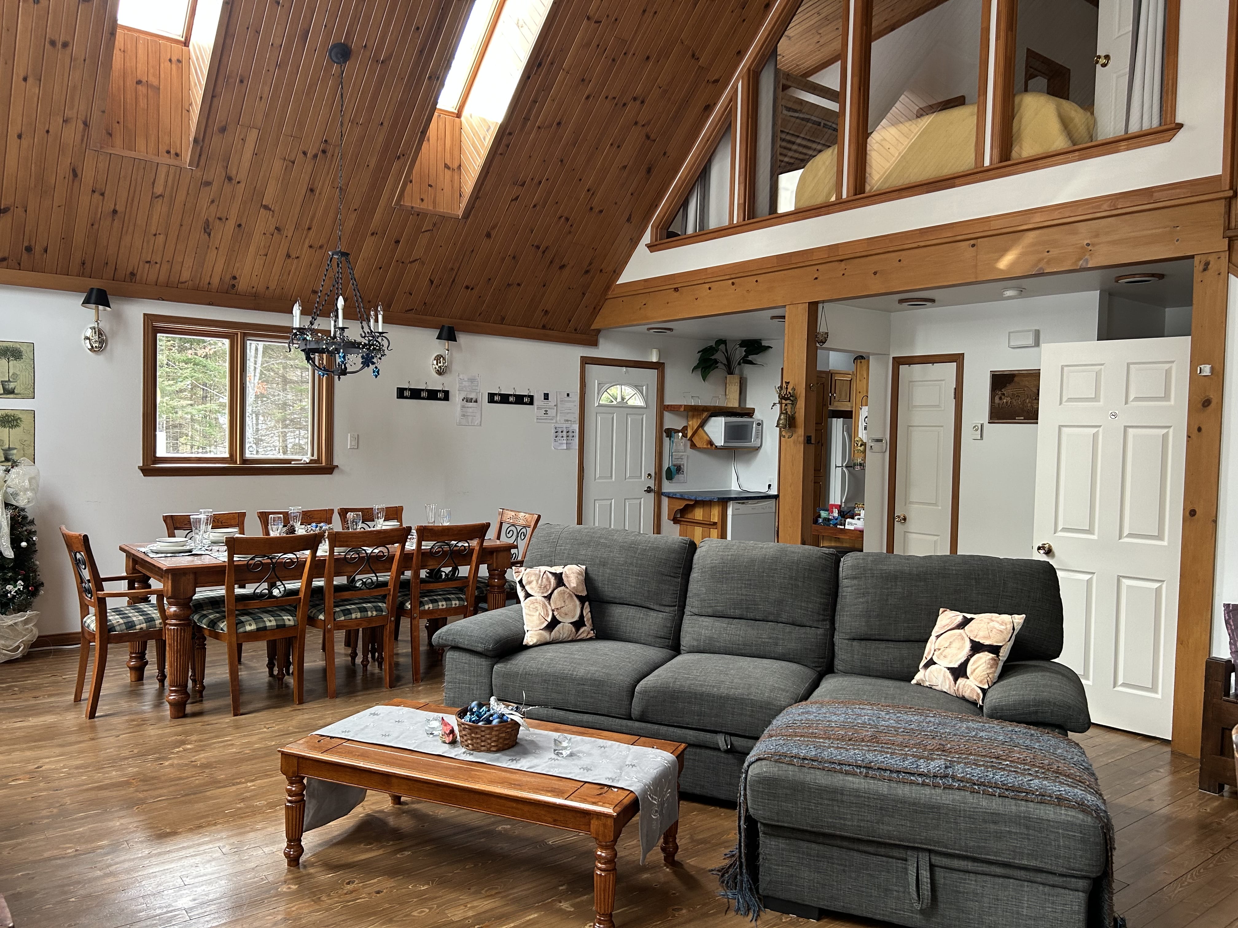 À l’intérieur, le plafond cathédrale et les puits de lumière créent un espace lumineux et aéré. Un superbe foyer en pierre à combustion lente trône au centre du salon, apportant chaleur et ambiance. La cuisine entièrement équipée contient tous les ustensiles nécessaires pour préparer de délicieux repas. Le chalet allie confort et convivialité, tout en offrant un cadre paisible et propice à la détente face à la beauté naturelle du lac.